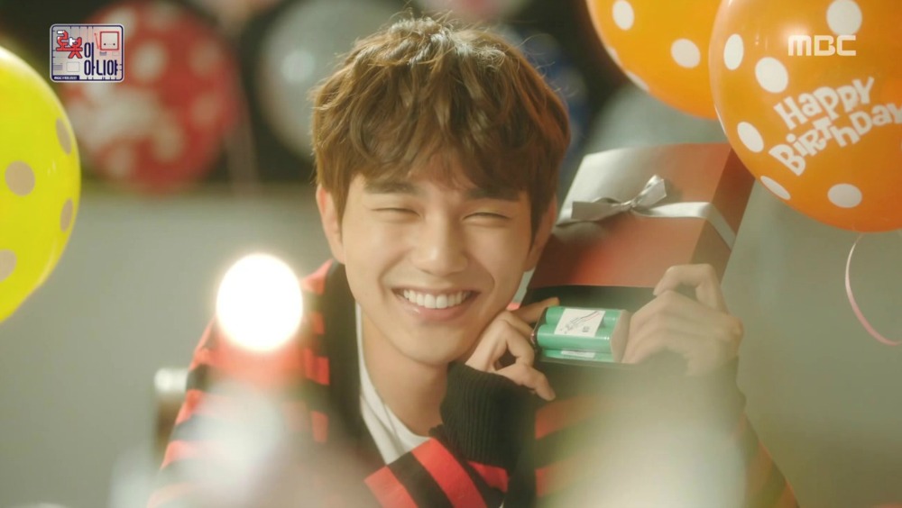 Dikelilingi oleh balon, tamu kehormatan Min-kyu adalah sebuah vacuum cleaner robot yang dilengkapi dengan topi ulang tahun. Dia mengatakan, "Selamat Ulang Tahun, cutie kami," dan memberikan hadiahnya, satu pak baterai baru sehingga dia bisa bertahan lama.